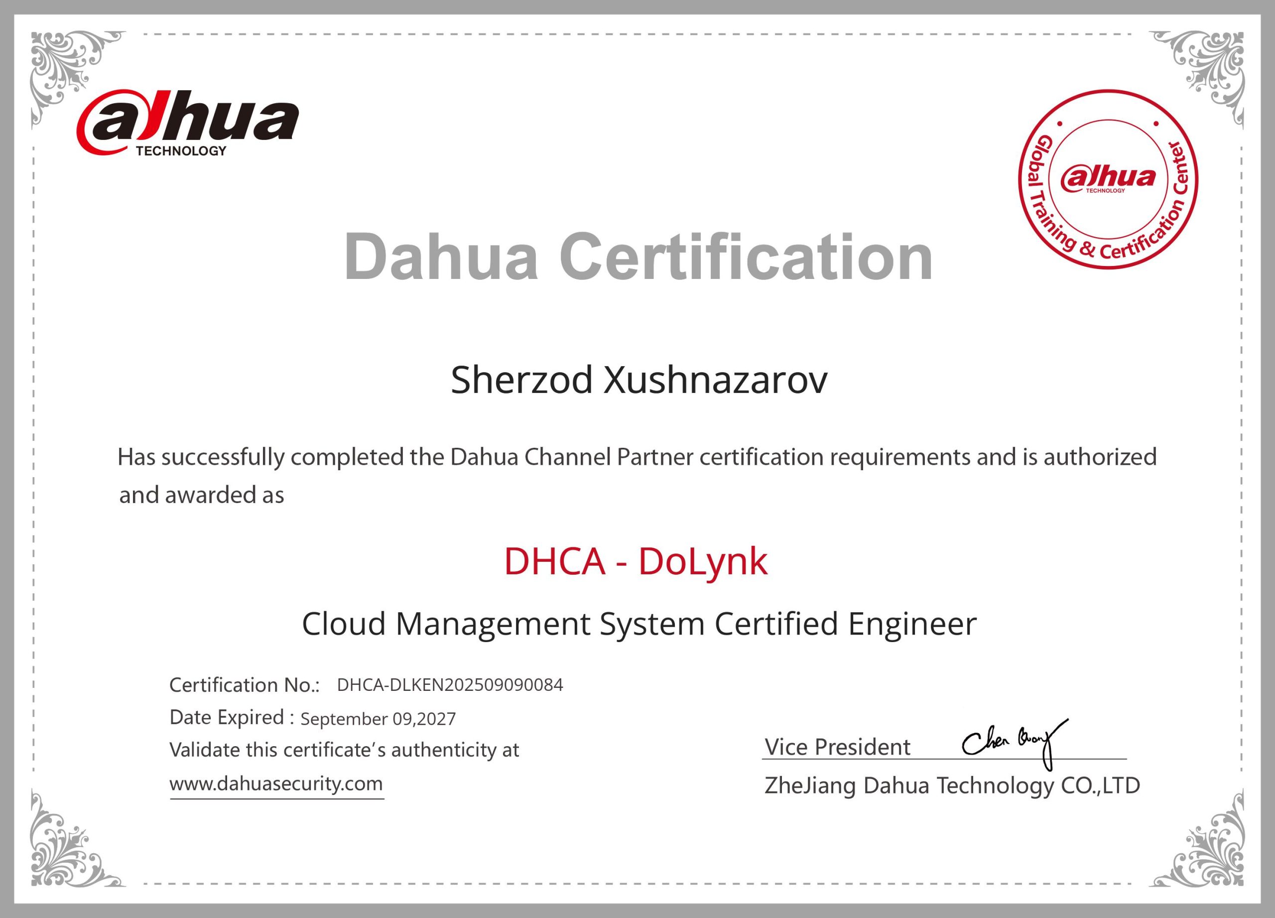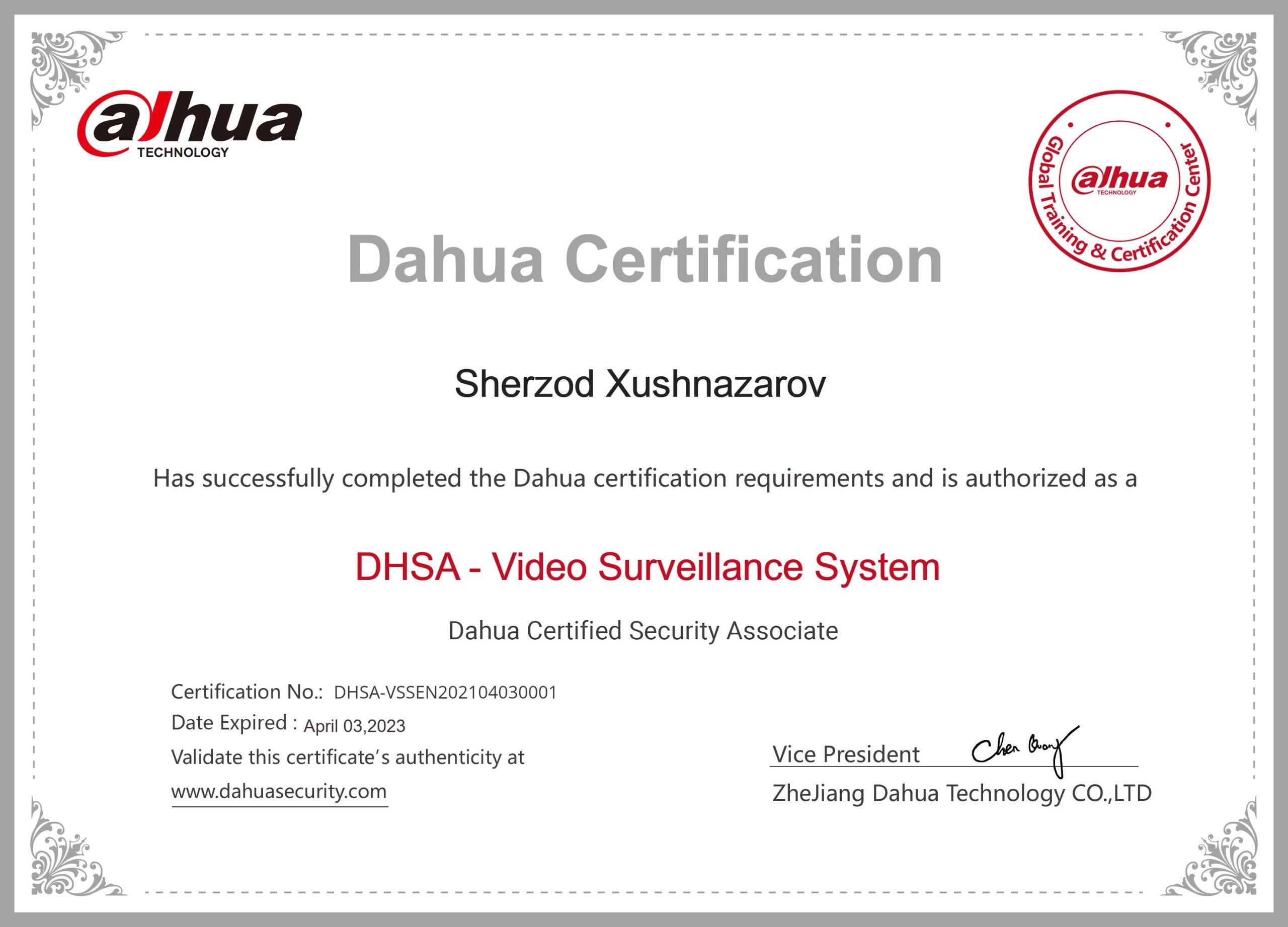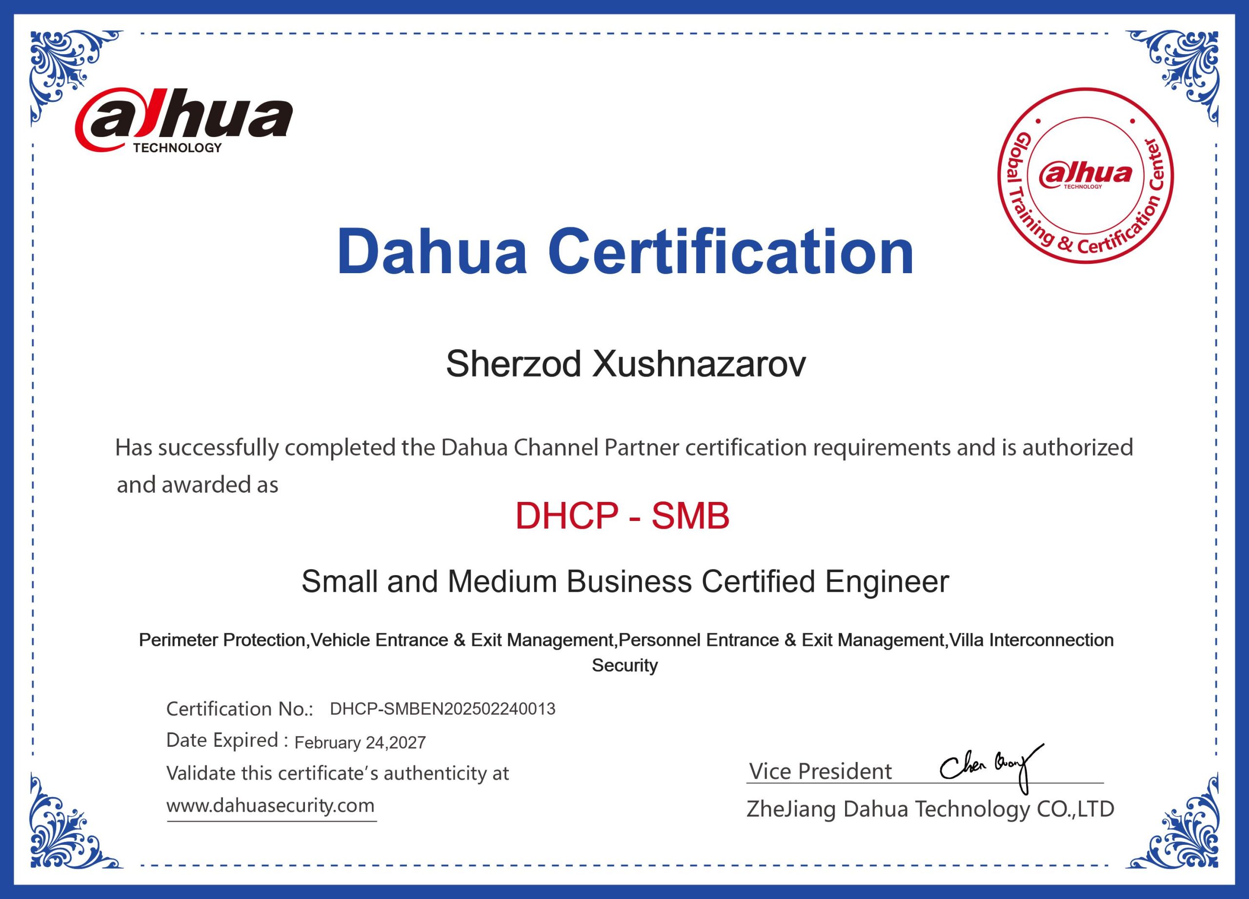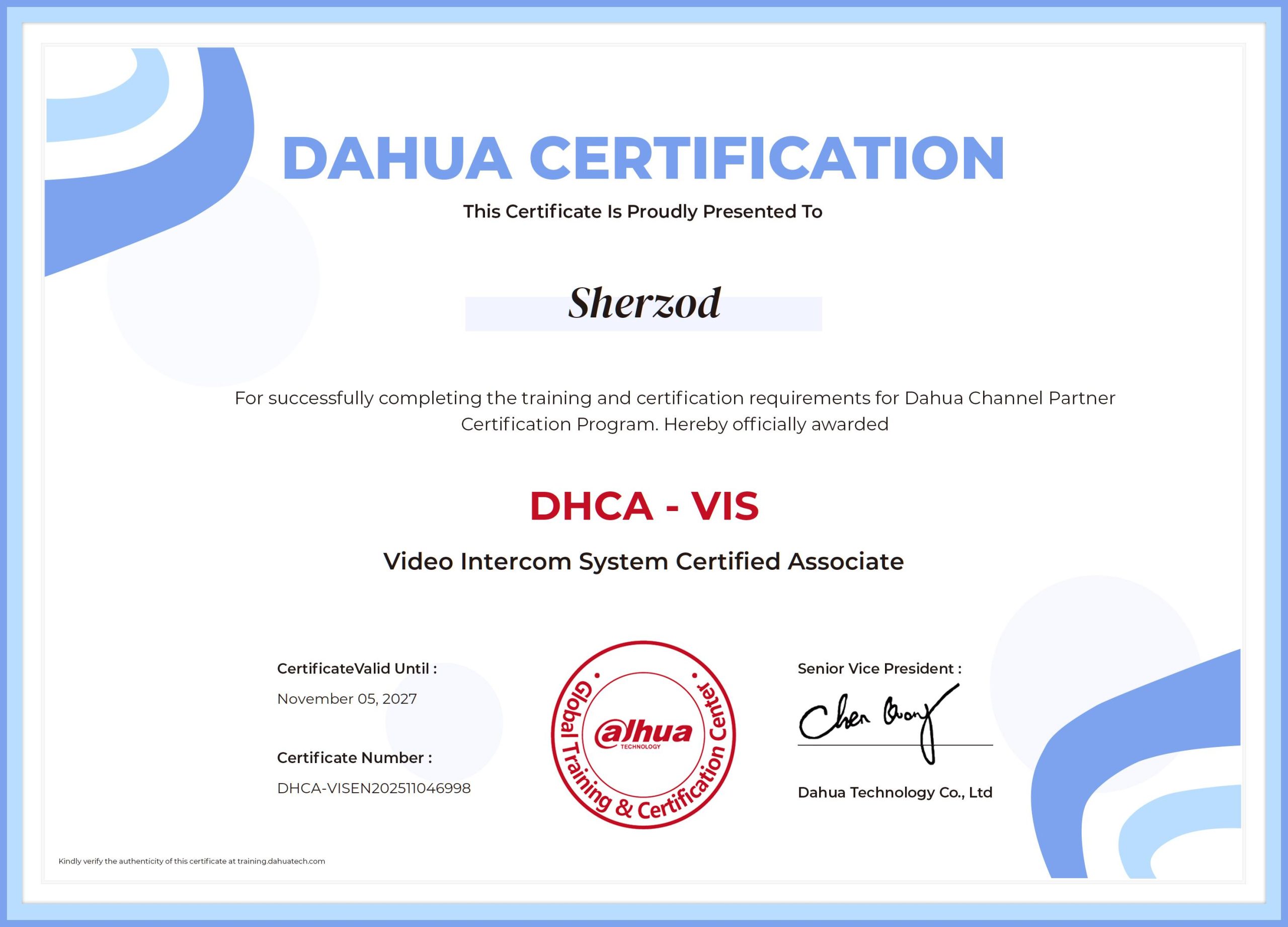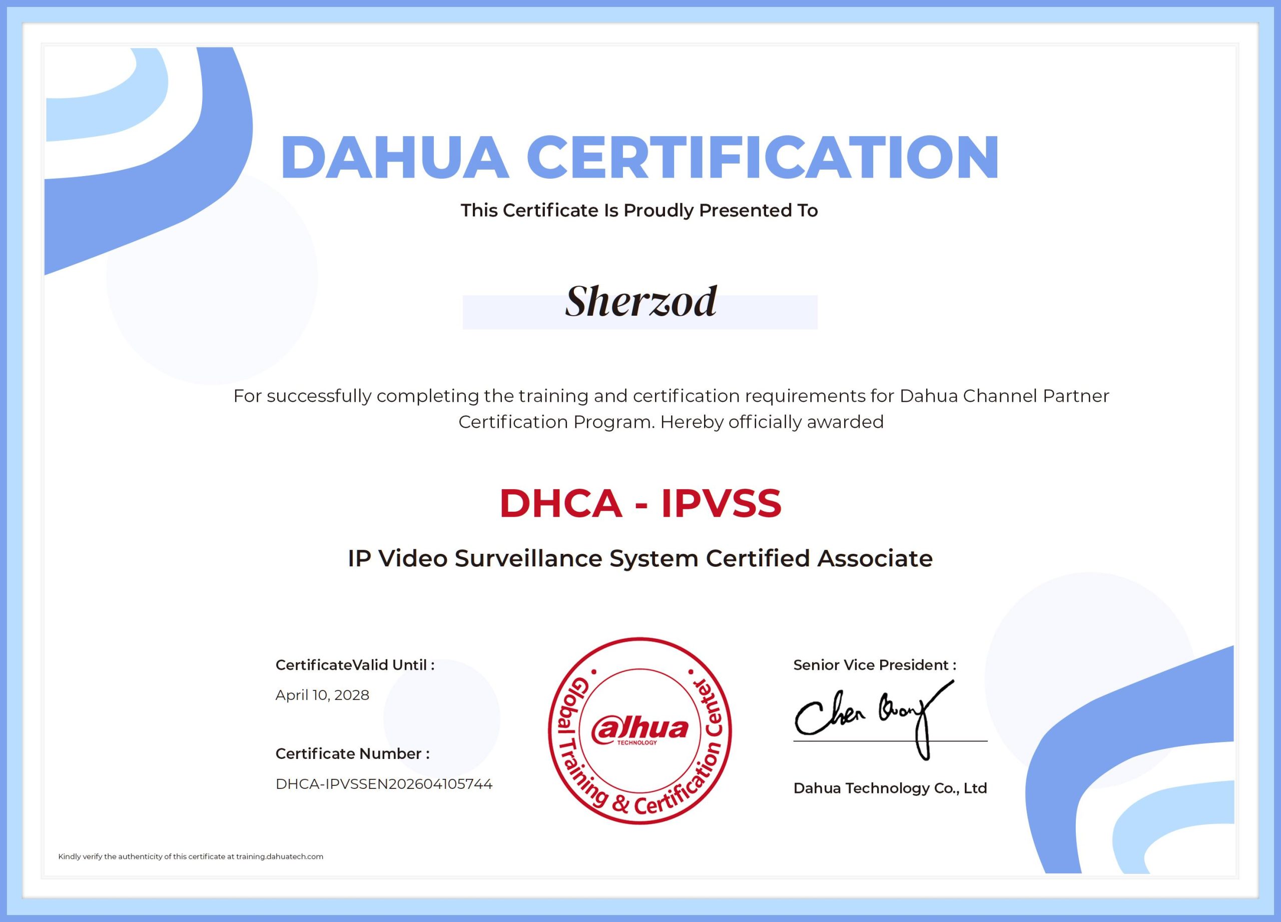 Dahua Technology tomonidan berilgan sertifikatlar bizning xavfsizlik tizimlari sohasidagi bilim va tajribamizni tasdiqlaydi. Bu orqali mijozlarimizga yanada ishonchli va sifatli xizmat ko‘rsatamiz.